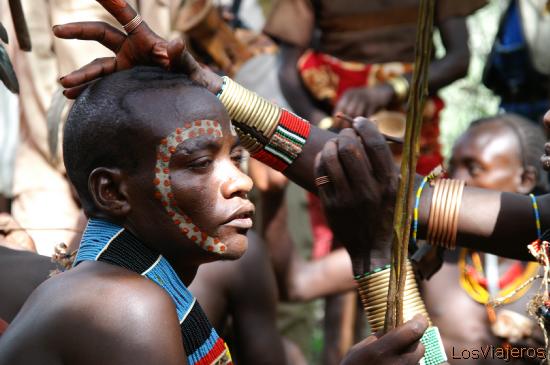 Pinturas de guerra - Valle del Omo - Etiopia: Los jovenes de la tribu hamer embellecen su cara con pinturas a mitad de la ceremonia.