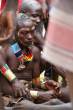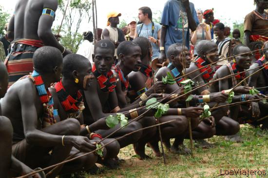 Young hamers sounds it sticks - Omo Valley - Ethiopia: After the secret part of the ceremony, the youths meet and they make sound their sticks to the unison.