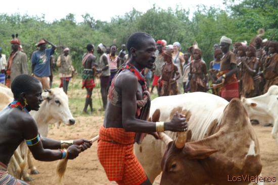 Selecionando el ganado - Valle del Omo - Etiopia: Selecionado el ganado que va a ser saltado. El ganado es separado uno a uno, hasta juntar unos 7 animales para ser saltados como parte final de la ceremonia.