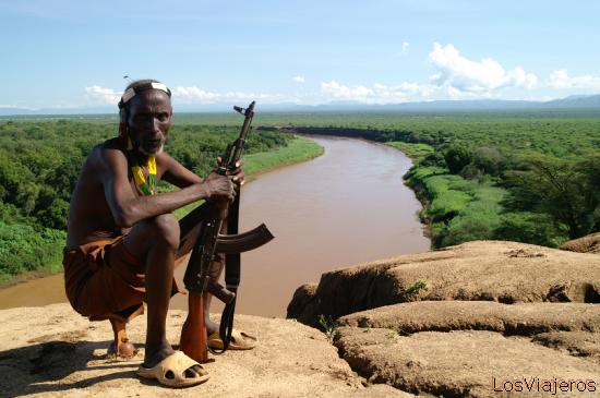 Viejo guerrero Karo - Murille - Valle del Omo - Etiopia: Viejo guerrero controlando el rio Omo... o mas bien posando.