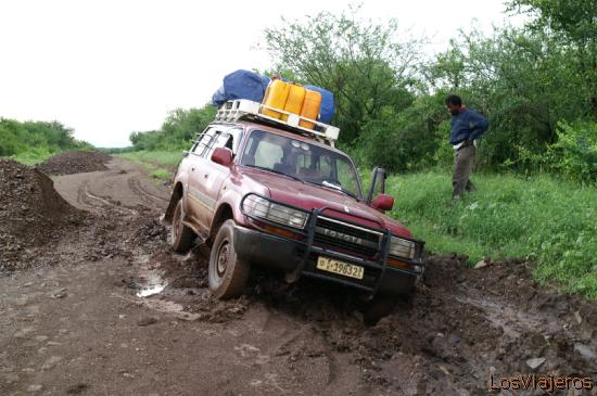 Coche atascado - Parque Nacional de Mago - Valle del Omo - Etiopia: Nuestro coche se quedo atascado e el barro y no pudimos continuar por este camino.