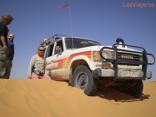 Our car trapped in the sand at a dune´s edge - Libya - Nuestro coche encallado en el borde de una duna - LibiaOur car trapped in the sand at a dune´s edge - Libya: going up or down, if the speed is not enough when reaching the edge, the wheel may stay off the ground. If too fast, then the car may overturn. Nuestro coche encallado en el borde de una duna - Libia: Al subir, o al bajar, llegando al borde, si no se va lo suficientemente rápido, pueden quedar las ruedas sin apoyo. Si se marcha demasiado rápido, se puede volcar