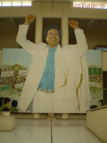 Leptis Magna, big Ghadaffi portrait - Libya - Leptis Magna, gran foto de Gadafi - LibiaLeptis Magna, big Ghadaffi portrait - Libya: Any place is good to homage the Libyan leader, in this case, a roman ruins museum.. Leptis Magna, gran foto de Gadafi - Libia: Cualquier lugar es bueno para ensalzar al lÃder libio, en este caso, un museo de ruinas romanas