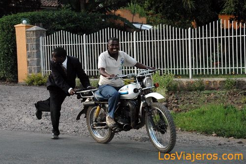 Rwandese population - Rwanda: Man with suit pushing damaged motorcycle Población ruandesa - Ruanda: Contraste: Hombre trajeado empujando a moto averiada