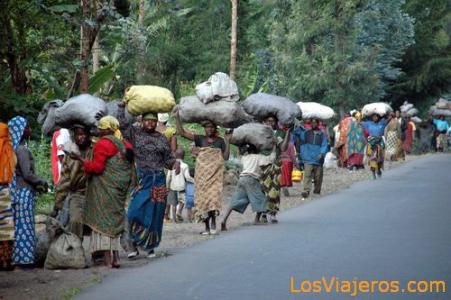 From way to the market - Rwanda: Rwandese people go to sell to the market, being transported the coats in the head De camino al mercado - Ruanda: Personas ruandesas se dirigen a vender al mercado, transportando los sacos en la cabeza