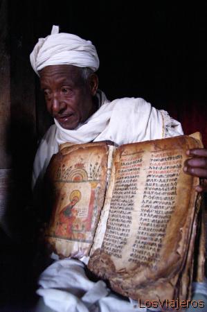 Antigua Biblia Ilustrada -Lago Tana- Etiopia: Monje de un monasterio del lago Tana enseñando una bella biblia ilustrada de unos cuantos siglos de antiguedad. El monje la databa del siglo XIV.