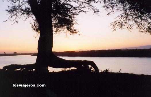 Atardecer en el Rio Omo - Etiopia: Raices de un arbol descubiertas por el rio Omo muy cerca de su desembocadura en el lago Turkana