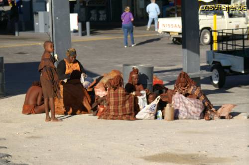 Tribu himba esperando a extranjeros - Namibia: Ir a ver a las tribus himba en sus poblados es complicado. Pero para ellos el turismo también es una fuente de ingresos. ¿Que hacer? Desplazarse a grandes ciudades para que los turistas te compren tu joyas y se hagan fotos.