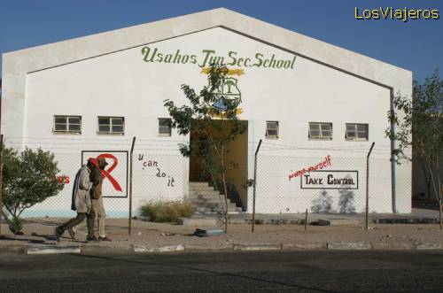 Publicidad sobre el SIDA en escuela - Namibia: Los mejores sitios para combatir en SIDA son las escuelas. Escuela tÃpica del centro de Namibia.