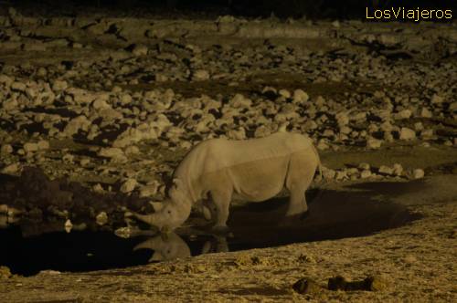 Rinoceronte en el Ethosa Park de Namibia: Impresionante, de noche, una charca iluminada.. se ven dos punto brillantes a lo lejos... se acerca un rinoceronte. Van llegando jirafas, elefantes.... Y de repente dos leones intentando cazar un de las jirafas. Y todo esto a uno 20 metros de nosotros. Por la noche es muy importante guardar los zapatos detro de la tienda para que no se los lleven los chacales.
