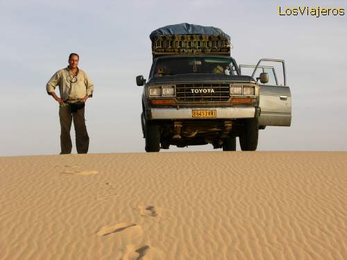 Un alto en el camino - Desierto del Tenere - Niger: Despues de cruzar interminables cadenas de dunas nos detenemos en lo alto de una para buscar un sitio para acampar de camino al Adrar de Tamgak (próximo al macizo del Air) desde el Arbol de Tenere.