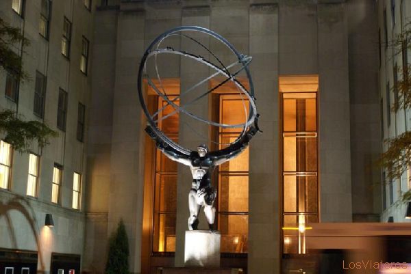 Atlas sculpture - New York - USA: Located at Rockefeller Center, Atlas carries the heavens upon his shoulders as punishment for defying Zeus. Designed and cast in 1936 by Lee Lawrie and Rene Chambellan, the statue's exaggerated musculature and stylized body are characteristic of the Art Deco style.