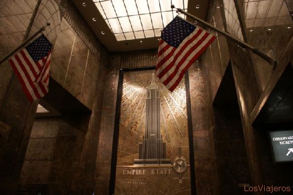 Empire State Building lobby - New York - USA: The lobby is three stories high and features an aluminum relief of the skyscraper without the antenna, which was not added to the spire until 1952.