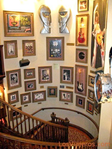 Interior del restaurante Hard Rock. - USAInterior del restaurante Hard Rock. - USA: Escalera que comunica los dos pisos del restaurante Hard Rock en el City Walk de Universal Studios. Es el restaurante más antiguo de la cadena. Los cuadros de la pared han sido cedidos por los artistas.
