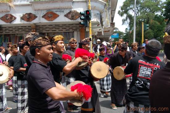 Cremation ceremony -Denpasar -Bali- Indonesia: Procession of bands during the cremation ceremony. Ceremonia cremacion -Denpasar -Bali- Indonesia: Procesion de orquestas en la ceremonia funeral de cremacion