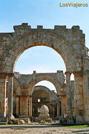 Basilica of St. Simeon - Syria - Basílica de San Simeón - SiriaBasilica of St. Simeon - Syria: After St. Simeon death in 459 AD the largest church at that time was built in his honour 60 km north of Aleppo. The complex is made up of a monastery, a baptistery with an adjacent church propylaea and a distinctive church or martyrion, with a Greek cross. BasÃlica de San Simeón - Siria: Tras la muerte de San Simeón en el 459 d.d.C. se construyó en su honor la iglesia más grande de la época, a 60 kms. al norte de Aleppo, el complejo está formado por un monasterio, un baptisterio con los propileos de una iglesia adyacente y una caracterÃstica iglesia de mártires que consiste en 4 basÃlicas unidas alrededor de un área semioctogonal en forma de cruz griega.