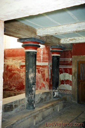 Palace of Knossos-Crete-Greece - Palacio de Knossos-Creta-GreciaPalace of Knossos-Crete-Greece: Throne hall.This small hall, used by the King as High Priest for religious rituals, has red stucco walls with drawings of stylized vegetable motifs, âgrifosâ (fabulous animals). Palacio de Knossos-Creta-Grecia: Salón del trono.Esta pequeña sala utilizada por el Rey como Sumo Sacerdote para rituales religiosos, tiene paredes de estuco rojo, con dibujos de estilizadas formas vegetales, grifos (animales fantásticos).