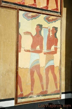 Crete-Palace of Knossos-Greece - Creta-Palacio de Knossos-GreciaCrete-Palace of Knossos-Greece: Paintings show the typichal male beauty and youth: long black hair, dark-skinned, exquisite clothes and jewellry.The most famous of the âeferentesâ is the one who carries a big blue âRhytonâ (a vessel imiting the shape of a horn, used for drinking). Creta-Palacio de Knossos-Grecia: Las pinturas muestran la tÃpica belleza y juventud masculina: largos cabellos negros; piel morena; ropas y joyas exquisitas. El más famoso de los eferentes es el que lleva un gran Rhyton (vasija que imita la forma de un cuerno y servÃa para beber) azul.