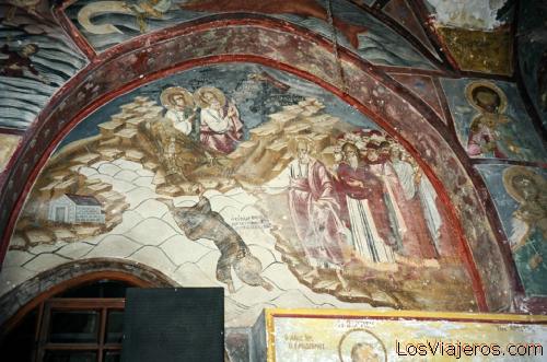 Patmos-Fresco in Monastery of Aghios Ioannis Theologos-Greece - Patmos-Fresco del Monasterio de San Juan el Teólogo-GreciaPatmos-Fresco in Monastery of Aghios Ioannis Theologos-Greece: Patmos is an important site for Christianism, because Saint Johhn was banished there in 97 AD, during Roman dominion, and wrote there The Apocalipse Book. The Monastery has excellent frescoes in the atrium. Patmos-Fresco del Monasterio de San Juan el Teólogo-Grecia: Patmos es un lugar importante para el cristianismo, ya que allà estuvo desterrado San Juan el Evangelista en el 97 d.d.C, durante la dominación romana y escribió allà el Libro del Apocalipsis. El Monasterio tiene excelentes frescos en el atrio