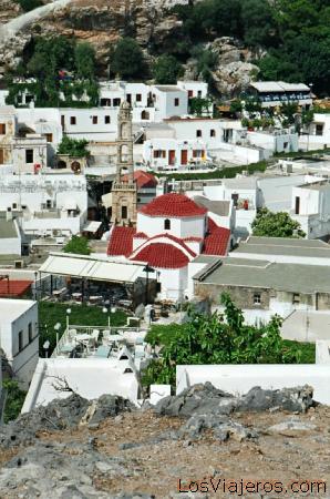 Rhodes-View of Lindos-Greece: The modern city of Lindos at the foothill of the Acropolis with he islandâs omnipresent Byzantine churches.