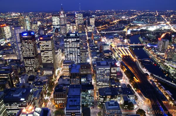 General view of Melbourne - Australia: View of Melbourne city centre on the night. Yarra river on the left.
