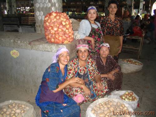 Escenas de mercado -Samarcanda-UZBEKISTAN - Asia: Las mujeres tienen por costumbre de depilarse las cejas y pintarselas después, a veces con un único trazo. Se aprecia la diversidad etnica, uzbecos,tayicos,rusos,kazacos..