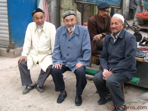 Los tres amigos-Kasghar.-China - Asia: Se aprecia las diferencias fisicas entre chinos y Uyghurss